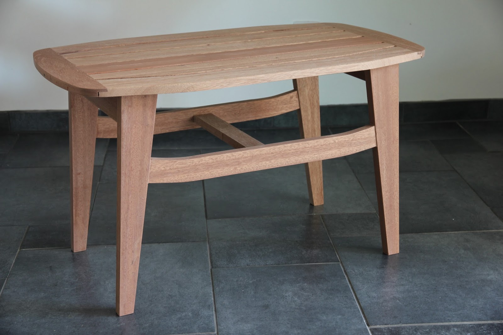 I had a family brief to make an outdoor table to go with a curved teak bench not more than 850mm long and be about 500mm high. That is rather high for such a small table and was to lead to problems later......